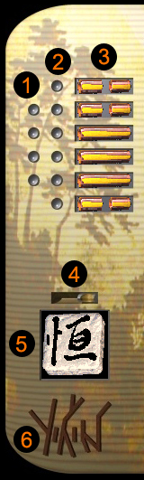 1 : Trigrammes internes 2 : Textes de chaque ligne 3 : Type des lignes 4 : Bascule entre hexagramme principal et mutant 5 : Jugement, commentaire et lecture technique 6 : Poser une nouvelle question dans le mode courant |